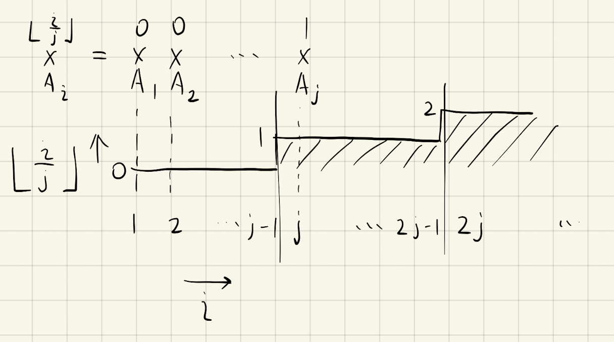 \left\lfloor \frac{i}{j} \right\rfloorはiがj増えるごとに1増える関係にある