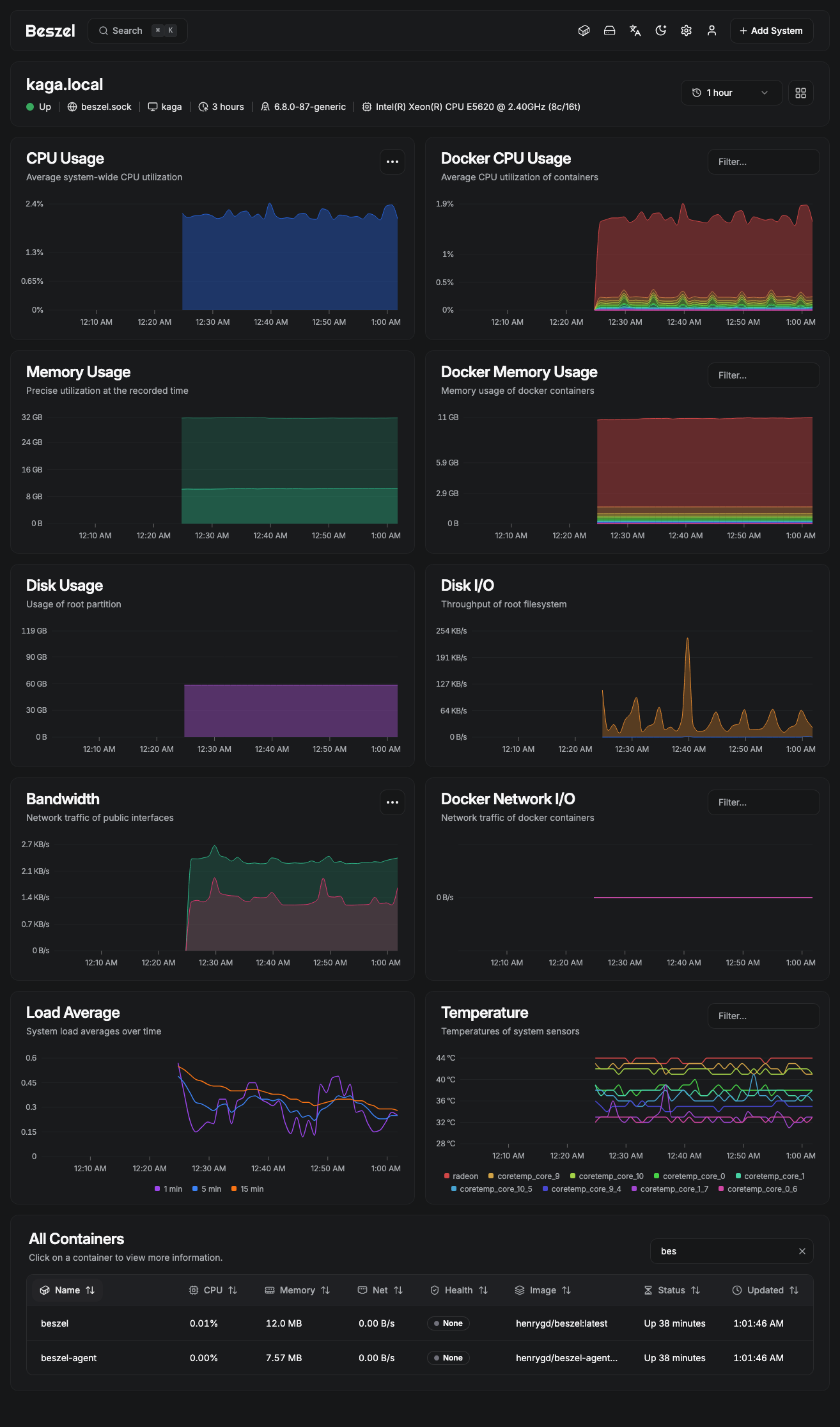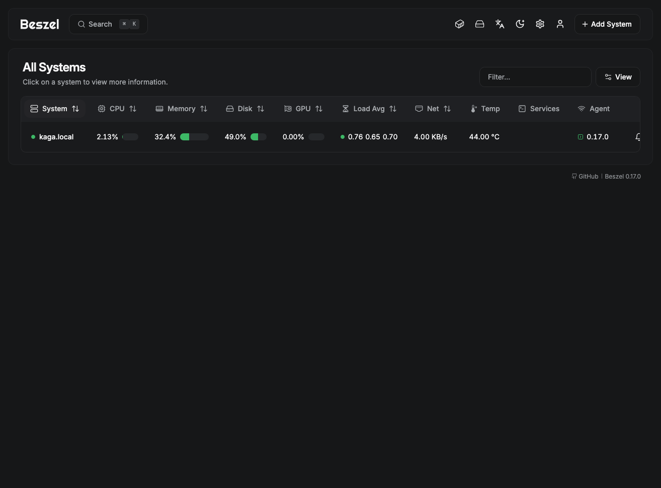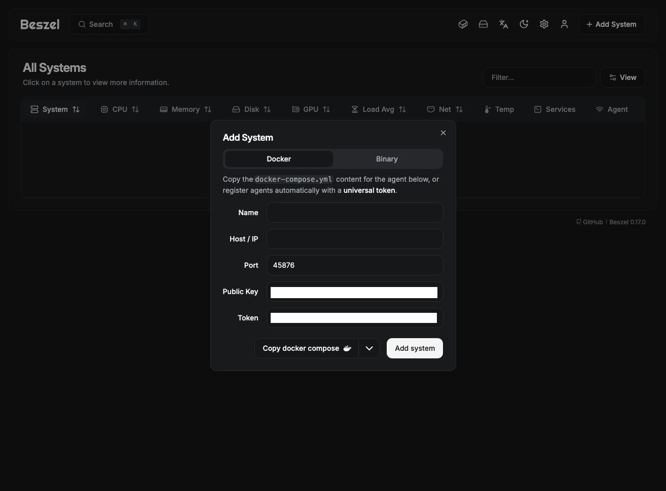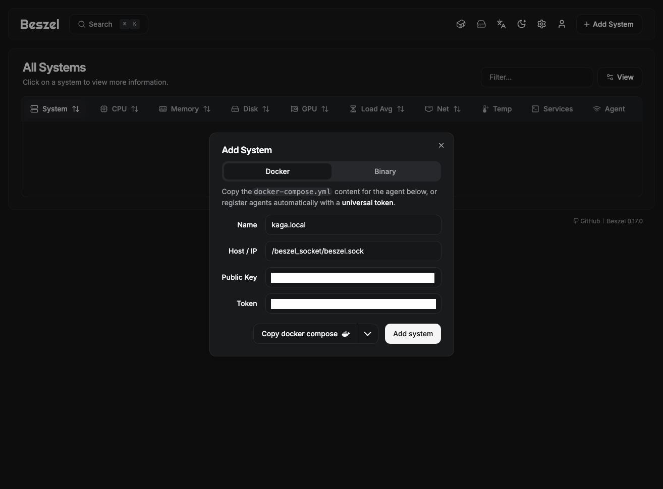 ^Cで一度コンテナを停止。docker-compose.ymlの<key>と<token>を先ほどの"Public Key"と"Token"で置き換えるdocker compose up -dを実行。Beszelをデーモンとして起動する再び"Add System"をクリック。"Name"には適当な名前、"Host / IP"には"/beszel_socket/beszel.sock"を入力