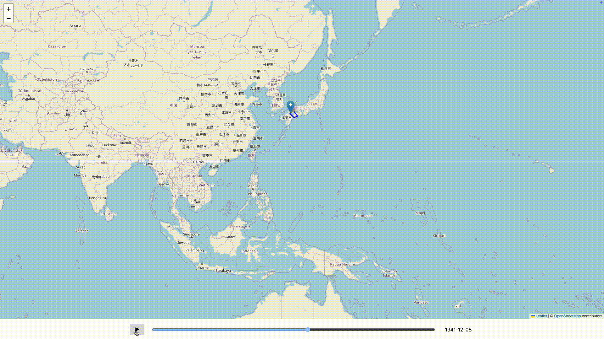 戦艦大和の1941年12月8日以降の行動の軌跡です。突貫で作ったので見た目は多分に改善の余地がありますが、大和がいつ、どこにいたのかは一目でわかるかと思います。